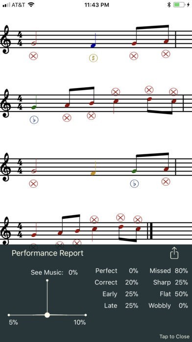 "See Music" will challenge your reading skills and give you feedback on your performance in real time. "See Music" will listen to you and give you a complete performance report with rhythmic and pitch accuracy, missed notes and all the relevant information you'll need to improve your playing.