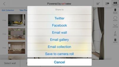 壁に飾るアートが決まったら完成した画像をメールに添付して送信したり、SNSで共有してみましょう。自分以外の他社からの意見を聞くことにより最中的な決定が行える機能です。