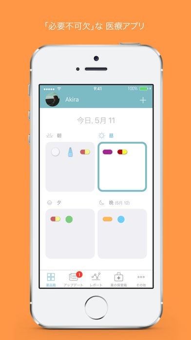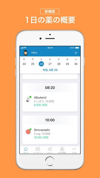 一日に服用するお薬の内容が確認でき、服用時間が来たら通知が来るので飲み忘れを防げる