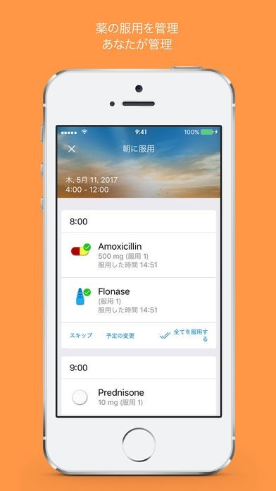 病院から複数の薬を処方され、時間差で服用しなければならない時、設定時間に通知がくるように登録すれば薬の飲み忘れを防ぐことができます。一日に飲む薬と服用時間を一覧で確認することも可能です。