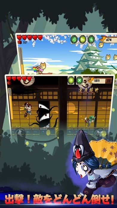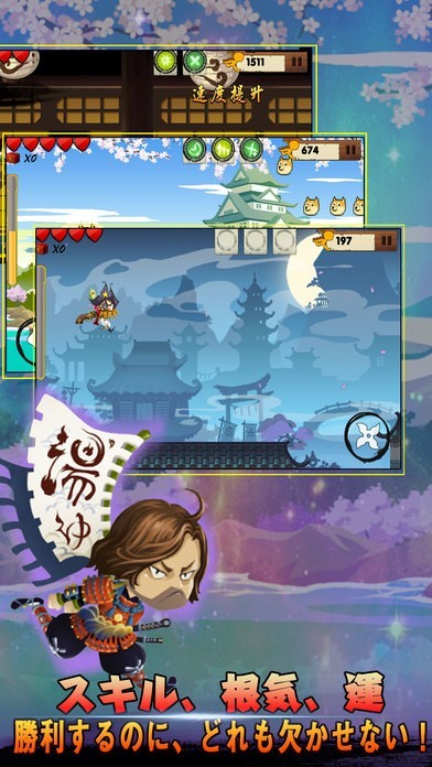 「忍者ダッシュⅡ」は、ダウンロード数1000万以上を超えた「忍者ダッシュ」の新シリーズのゲームになっております。オリジナルキャラクターが作れる変装システムなどを使いながら敵に出撃し、進んでいく内容になっています。途中、槍やとげなどが出現しますが当たらないように上手くジャンプしながら進み、手裏剣などを投げて敵を倒していきます。お城が出てきたりと和風なデザインで、BGMも設定されているので忍者になりきってプレイすることができます。