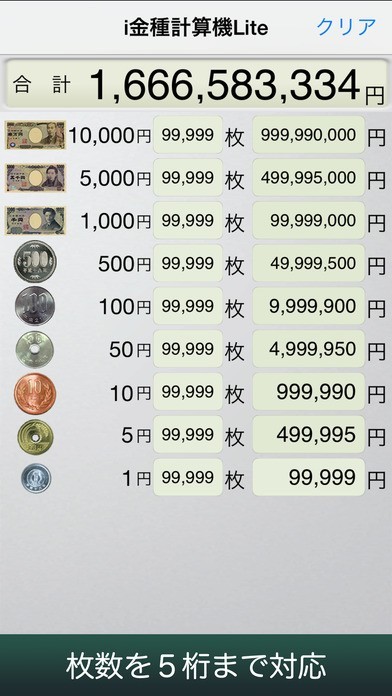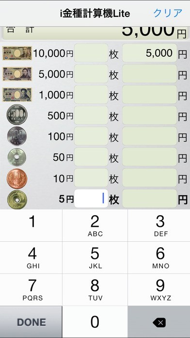 i金種計算機Liteは、レジの清算や貯金箱に入っているお金を種類ごとに分けて計算する計算機