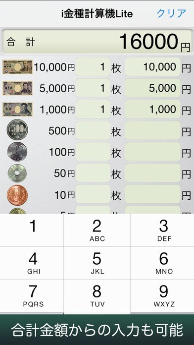 紙幣と硬貨の数から合計金額を計算でき、合計金額から紙幣と硬貨の数を計算することもできるアプリです。紙幣と硬貨の数字だけでなく図柄も表示されるので視覚的に分かりやすいです。枚数だけ数えればよいので電卓より早く計算することができます。間違った金額を入力するとエラー表示が出るのでミスも防げます。 タップとテンキー入力だけの簡単操作で全ての計算を終わらせることができます。大量の小銭を計算したり、フリマの売り上げを計算する時などに役立ちます。