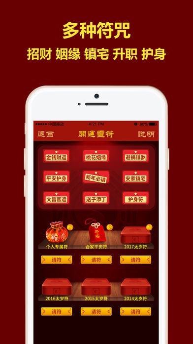无论是金钱财运,送子添丁,还是桃花姻缘,避祸镇煞,都可以在转运灵符app中求得自己想要的灵符。灵符可以守护你免于一切灾难,灵符可以给你带来财富、地位和名誉,灵符可以提升你所有的运势。