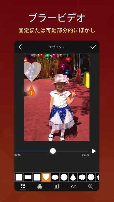 フィルターによって多彩な特殊効果を動画にかけることができます。1コマ1コマ表示できるので簡単に加工可能です。ぼかしは全体にかけることも一部だけかけることもできます。