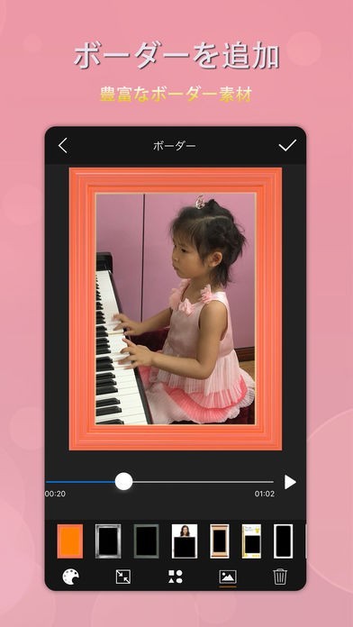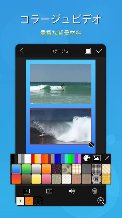 背景素材が豊富に用意されているので、動画に背景を付けて簡単にコラージュ動画を作成することができます。背景は一覧で表示されるのでタップするだけで選んでコラージュできます。