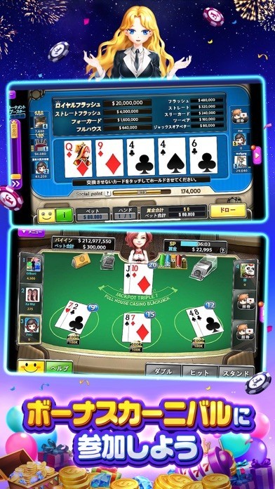 テキサスホールデムやバカラ等の複数のコンテンツが用意されていて、自由にカジノゲームが楽しめるようになっています。また手軽にチップを入手する事が可能で、各モードに素早く参加出来るのも利点です。