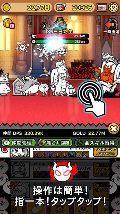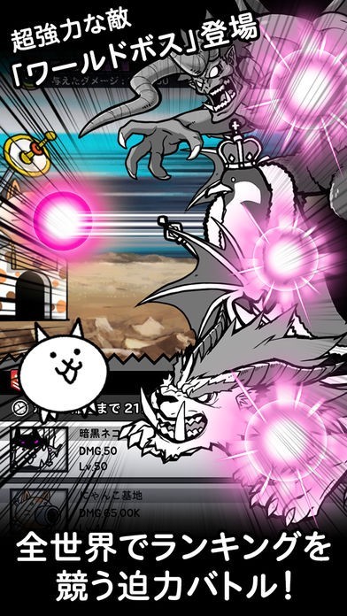 キモカワイイ猫たちの軍勢が繰り広げるバトルが楽しい!強いボスは画面タップの連打で撃退しよう!