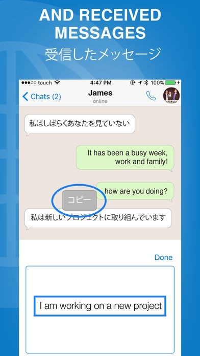 受信したテキストや送ったメッセージを簡単に翻訳する事が可能です。また本文のコピーや貼り付けにも対応しているので、友達や同僚へ文章を共有したい時に重宝するでしょう。