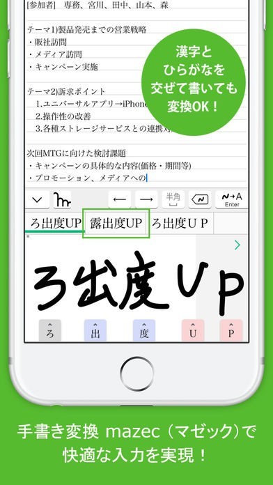 会議の内容を手書きに速記することができるようになっています。また、手書きで記録するだけではなく、音声までも同時に録音することができるような機能が搭載されています。