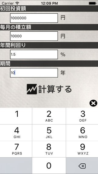計算機能で、初回投資額と毎月積立額、年間の利回り、期間の数字を入力して計算する