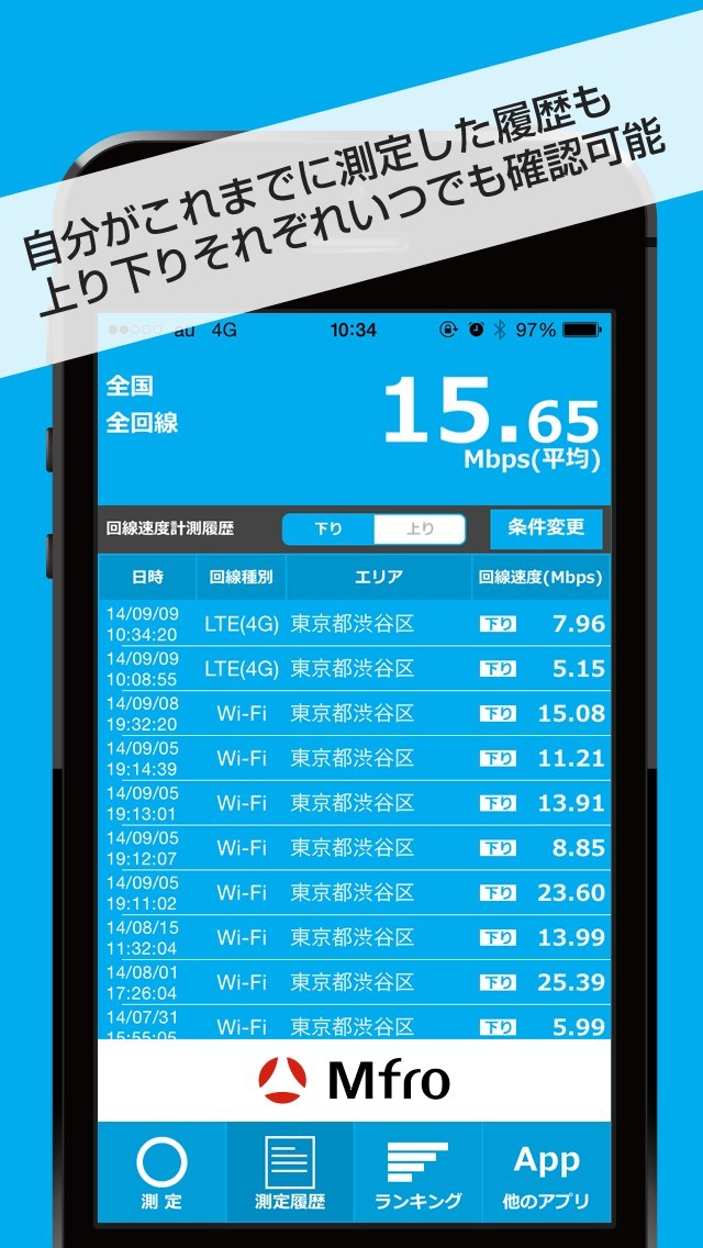 このアプリを使うことによって、上りと下りの回線速度を「測定開始」ボタンを押すだけで知ることが出来ます。さらには結果をツイッターやフェイスブックなどで共有することが出来るので、他の方の結果を見て、どの回線を選ぶのかの参考にしたり、とくに同じ地域に住んでいる方のデータはとても役に立ち自分にも同じような影響を与える可能性が高いのでチェックするべきです。 他にも「ランキング」によって、自分の速度が速い方なのか遅い方なのかを把握することが出来るので、あまりにも遅かったりする場合には原因を探ることで改善が期待できるかもしれません。