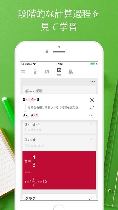 Photomath - カメラ計算機は、カメラを使った最新式の計算アプリです。教科書やテキストを用意したらPhotomath - カメラ計算機アプリを起動し、数式にカメラを向けて、書かれている内容をスキャンしましょう。正しくスキャンできれば数式をPhotomath - カメラ計算機が読み取り、解答を導き出してくれます。解答は計算式で順を追って表示されるので、どういった計算をしてその答えが成り立つのかを確認しながら、数式を理解することができるでしょう。手書きの数式でも読み取りは可能であり、使い方は無限大です。