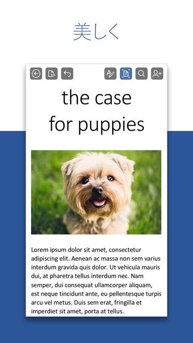 全世界に多数のユーザーを持つ「Word」のアプリ版が登場! 「Microsoft Word」は、文書ファイルとして利用頻度の高い形式に対応した文書作成アプリです。 使いやすい文書作成機能を搭載する他、挿入位置をタップで選びながら画像挿入なども可能。 ビジネスシーンでも役立つ複数ユーザー機能を用意し、複数のユーザーによる共同編集も行えるようになっています。 作成した文書はスマートフォンに合わせて美しく表示。プレゼンテーションの資料として活用することもできるでしょう。