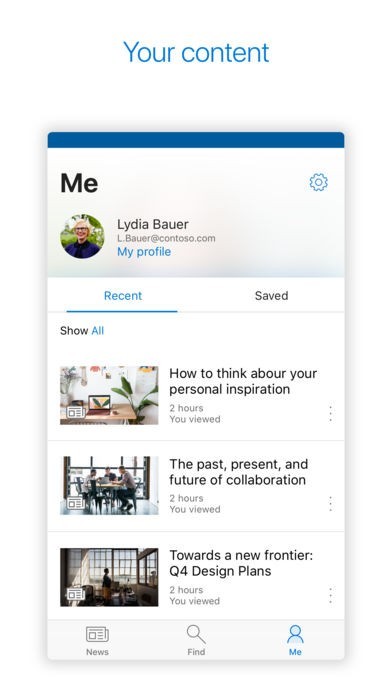 必要な情報を、インターネット上だけでなく、「Microsoft SharePoint」上のログから検索できるのもこのアプリの強みです。関連性と正確さがあがるエンタープライズ検索では、最近編集したファイルや人物なども検索でき、情報を見つけるのに役立ちます。