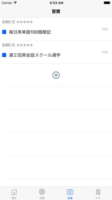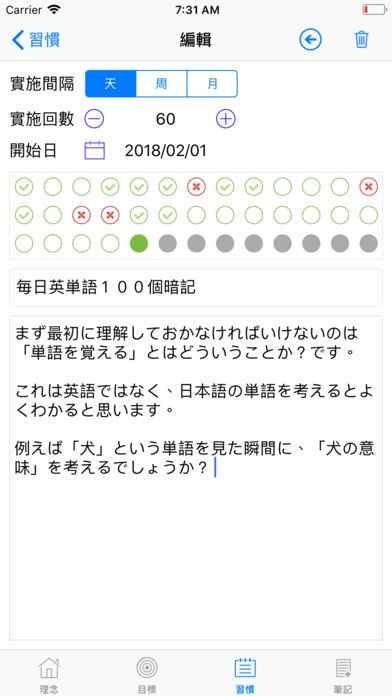 決めた目標を達成するために必要な習慣を設定することができます。習慣は最初に総実施回数を設定して、ちゃんと取り組めたらチェックする欄が設けられています。1回チェックするたびに実施回数に1回プラスされていきます。