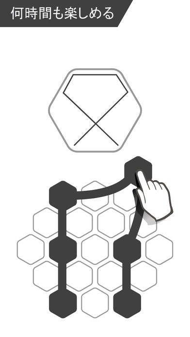 六角形のマスがあり、お手本通りにロープを並べられたらクリアです。最初はロープの結び目が一つしかなくて簡単ですが、だんだん難しくなります。パッケージ2では余分なロープを切れます。