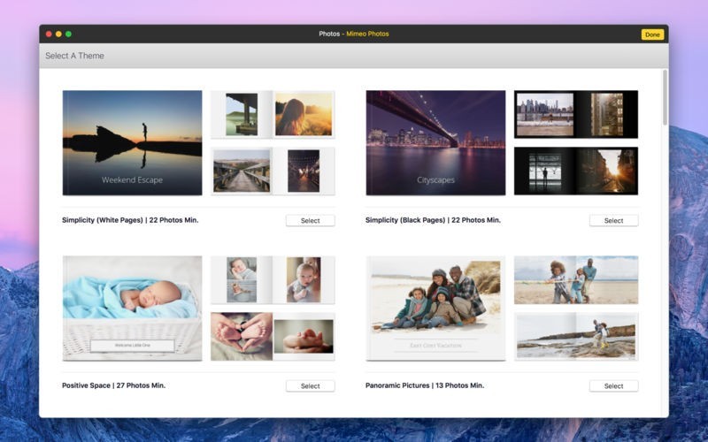 After installing from the Mac App Store, get started by simply visiting My Projects and selecting Mimeo Photos from the dropdown. You’ll now be able to choose from a wide range of our premium quality print products.