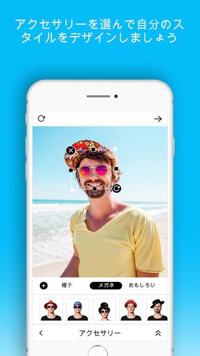 写真に様々なステッカーが挿入出来ると同時に、髪や髭等のアイテムが付けられるのも面白い