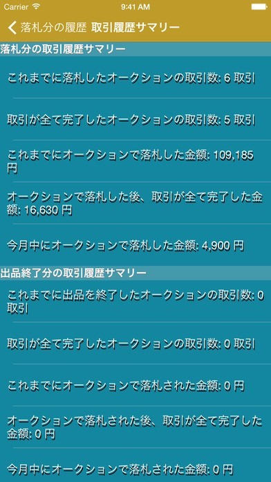 オークションというアプリの良い点はこれまでヤフオクで取引したデータのサマリー情報を登録した範囲でいつでも確認できるようになるという良さがあります。これで簡単に今月のヤフオクでの利益や取引件数の管理ができて便利です。