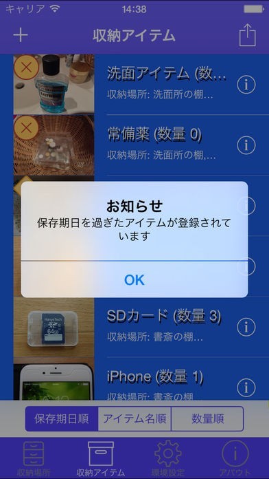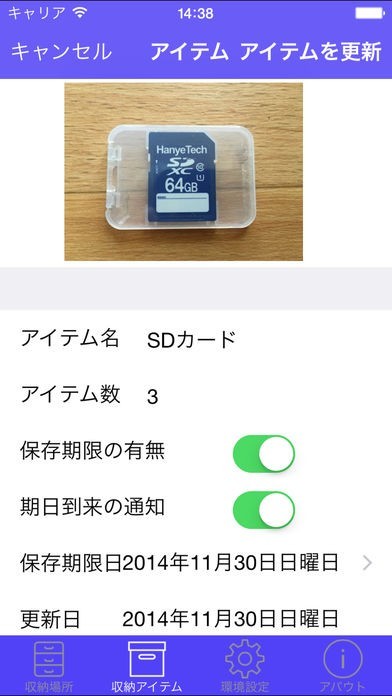 このアプリは、自宅や会社等で大切なものをしまっている場所を、そのアイテムと関連付けて管理、検索できる便利ツールです。収納する場所とアイテムは写真やカテゴリー、保存期間等で即チェックできるほか、収納場所をGPSの位置情報で記録することも可能です。また、アイテムの保存期日が到来したタイミングを、通知サービスで知らせることも可能です。