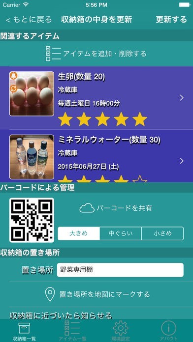 収納している場所を収納箱としてリストを作ってその中に入れている品物を収納品としてそれぞれリストを作ることができるから何をどこにしまっているのかを把握する事ができる収納アプリです。