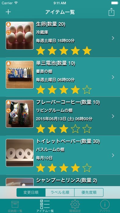 収納品リストのスクリーンショット