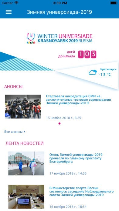 Если ты планируешь поездку в Красноярск на Зимнюю универсиаду-2019 или на одно из тестовых мероприятий перед Студенческими играми, хочешь быть в курсе всех важных событий этих турниров, а также интересно и весело провести время, рекомендуем скачать официальное приложение Зимней универсиады-2019 и посетить наш сайт www.krsk2019.ru