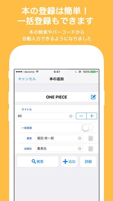 - 本の情報はWebから探して自動入力できます。バーコードも対応!