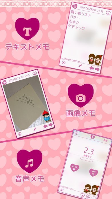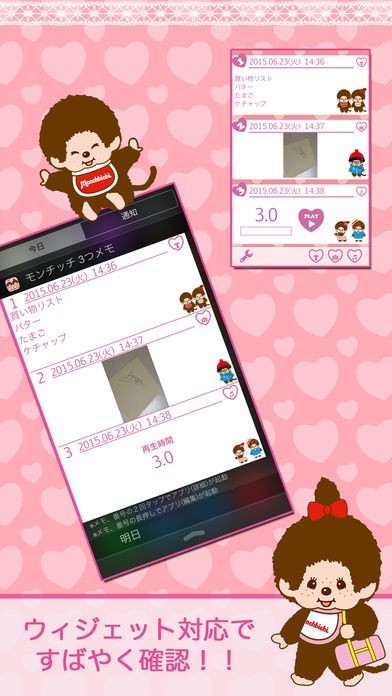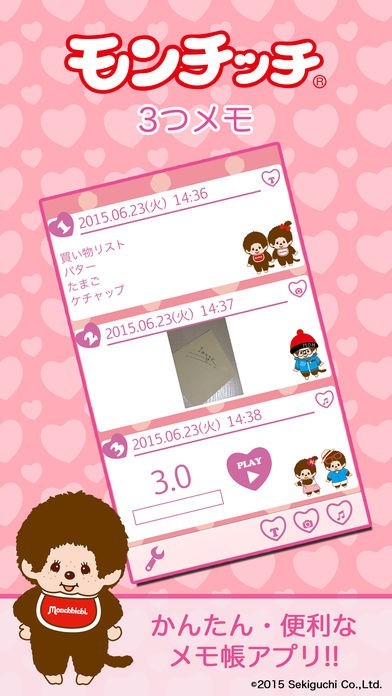 App Storeより引用かわいいモンチッチの簡単で便利なメモ帳アプリです。3つの登録枠にテキスト・画像・音声のメモやキャラクター画像を登録することができます。