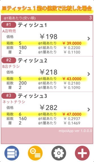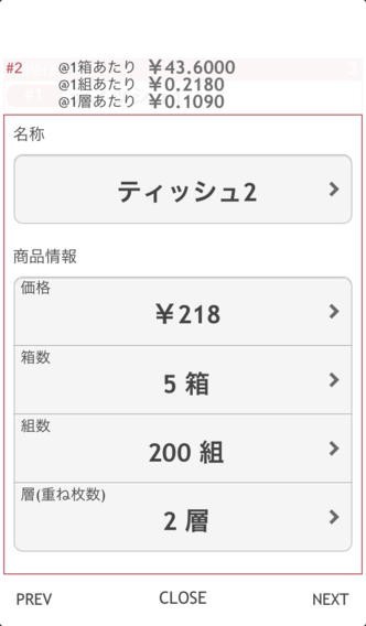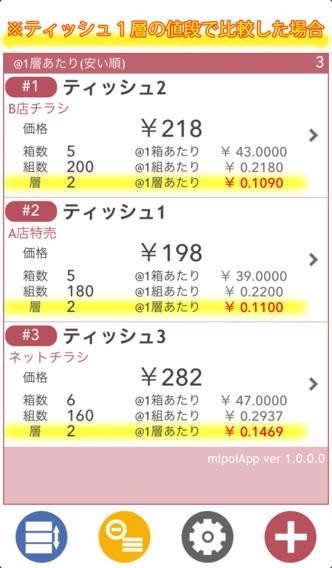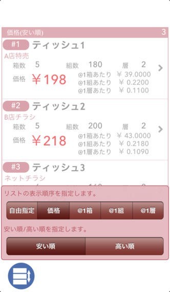 1箱と1組の単価が計算できるのはもちろんですが、ティッシュ1層あたりの単価まで計算してくれるので、まれにある3枚組のティッシュとも値段を比較することができます。