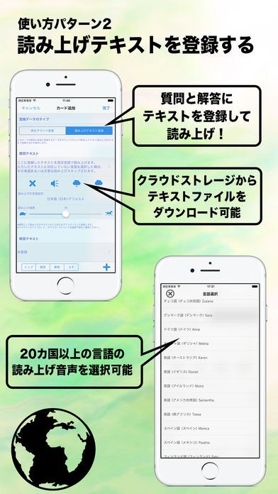 音声を録音して登録すれば、読み上げを繰り返し聞いて単語などを覚えることができます。また、テキストデータを登録して聞くこともできます。20カ国以上の言語に対応しているから、語学学習にもおススメです。