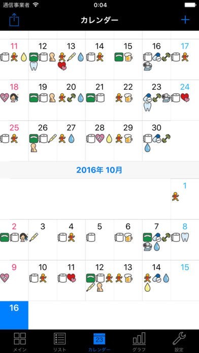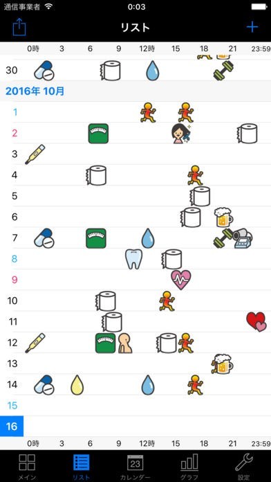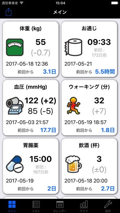 体重、血圧、ジョギングなど複数の数値を記録している場合でも、目立つアイコンやカレンダーなどで一括表示できて大変分かりやすくなっています。また、グラフでの確認もできて便利です。