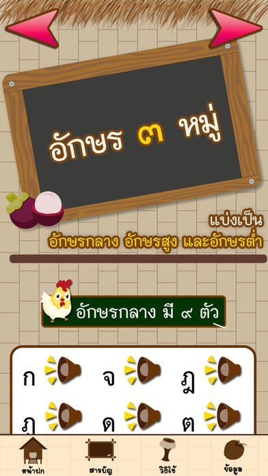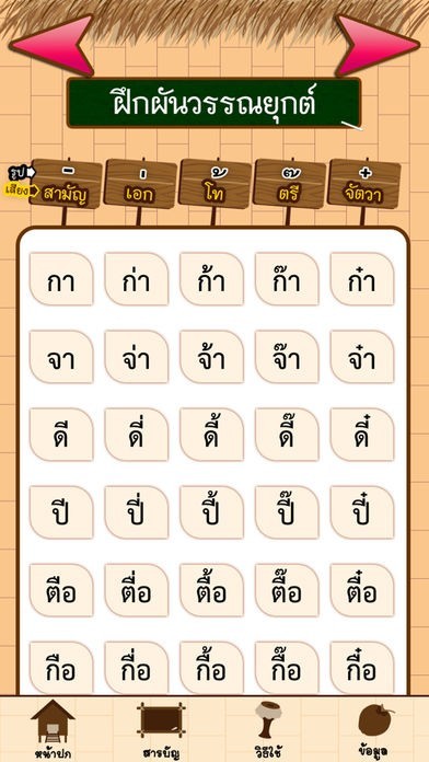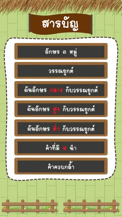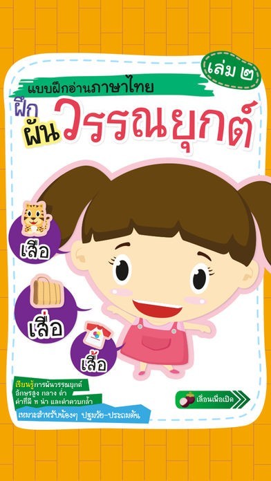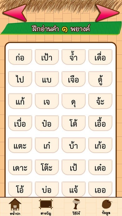 タイ語を読み始める幼児や小学校低学年向けのアプリケーションです。高子音、中子音、低子音、「ห」が直前に置かれる語、二重子音に分かれて、声調について説明します。単語および文の読む練習があり、発音もしてくれます。挿絵もあるため、声調の違う単語の意味を考えると共に、周りのことも学習することができる。タイ語がしっかり読めるようになり、未来的に高度なタイ語能力につながります。