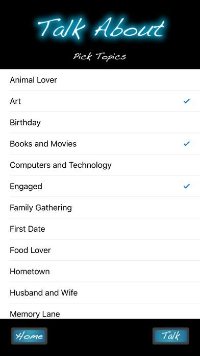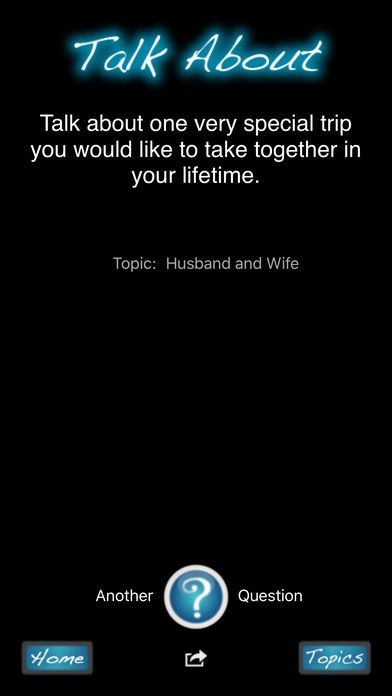 Talk About allows single topics to be selected to focus in on specific areas or multiple topics, providing an array of interesting conversations. Either way, you are sure to come away with greater insight into the people you spend time with the most.