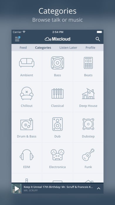 Mixcloud - Radio & DJ mixesというアプリは世界中のDJの曲がカテゴリー別に聞けてしまうというアプリになります。 その種類は約40種類でカテゴリーの中から選ぶ事ができるのでその時の気分に合った選曲が可能になります。 気に入った曲があったらその曲をMIXしたDJも簡単にチェックできます。