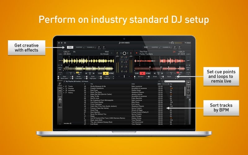 The design replicates the industry standard DJ setup : waveforms, Cue/Play/Sync buttons, mixer, hot cues, scratching, loops, effects. All the professional DJ tools are at your fingertips.