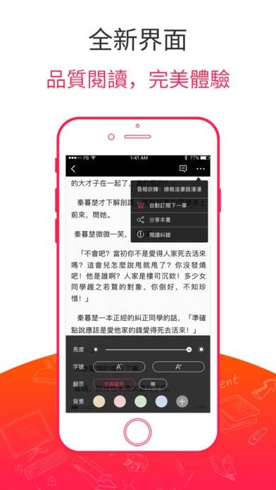 【品質閱讀】:多種閱讀主題、夜間模式、翻頁效果,隨意切換;