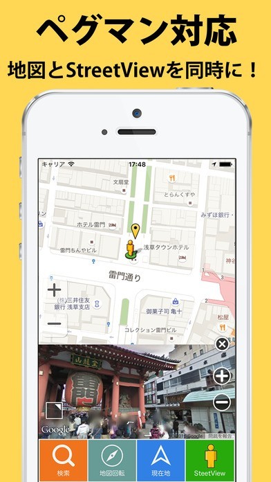 道に迷った際にiPhoneで地図を確認しても今一つ目的地までの道のりがわかりにくいことってありますよね。そんな困ったシーンで大活躍するアプリがStreetViewerです。このアプリの特徴は周辺地図を表示するだけではなく、周囲のストリートビューと合わせて表示することができるというポイントです。人の形をした黄色いアイコン、ペグマンを操作するだけで見たいエリアのストリートビューが映し出されます。初めて出かける場所の事前の情報収集にも使えます。