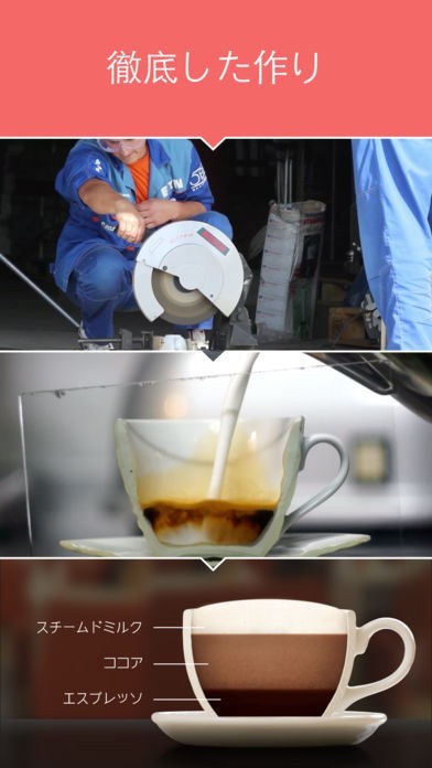 エスプレッソベースの飲み物は全て縦割り画像でカップの中身を覗くことができます。エスプレッソとココア、スチームミルクなど層になっている部分を横から眺められるので自分が作る時の参考になり便利です。