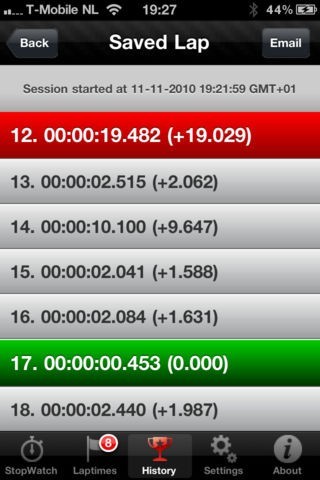 ラップタイムを保存しておけるだけでなく、ヒストリー画面から選択した記録をメールで送信することができます。データを共有する必要がある場合もこれで簡単に共有できます。