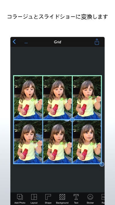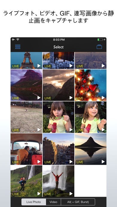 App Storeより引用[Live2 Photos]は、ライブフォト、ビデオ、動くGIF、連写画像から複数枚の静止画像を抽出する世界初のオールインワンアプリです。
