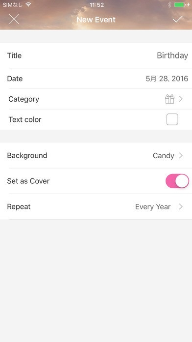 誕生日やイベントなどのカウントダウンは指定日を過ぎた後も、また再カウントダウンを自動で行うことができます。毎年繰り返し行われる予定はリピート機能をオンにすることで、再設定せずにそのまま使用できます。