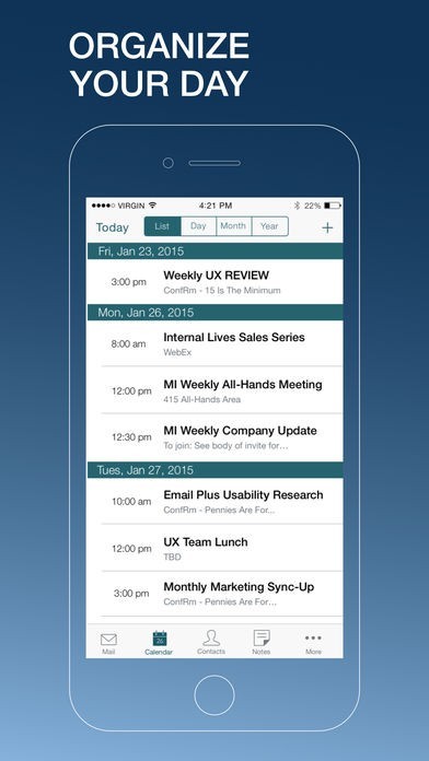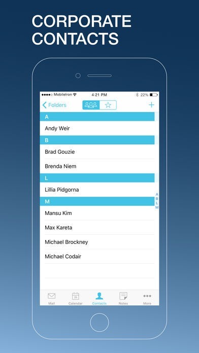 Secure Email - Secured by the MobileIron AppConnect platform and provides AES-256 encryption, application level passcode, certificate based authentication and managed copy/paste functions. Based on admin control, users can receive notifications for Email and Calendar in real-time.