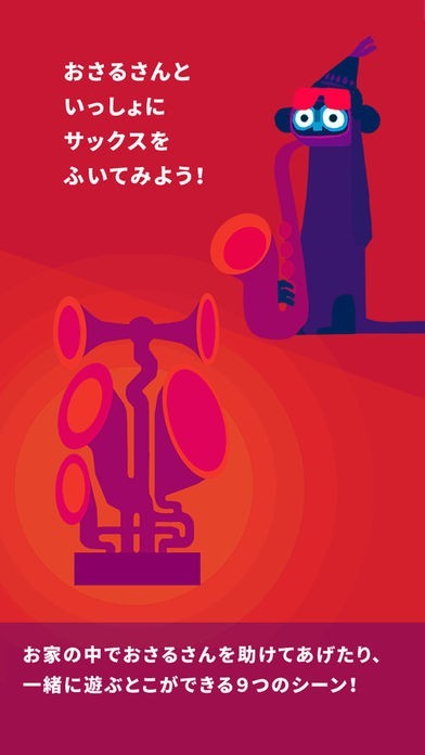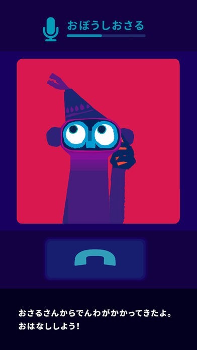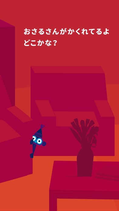 かくれんぼではおさるがどこかに隠れていますが、おさるは青色で背景は赤色なので、どこにいるのか見つけやすくなっています。おさるから電話がかかってきます。電話でお話しができるので、友達になった気分になれます。