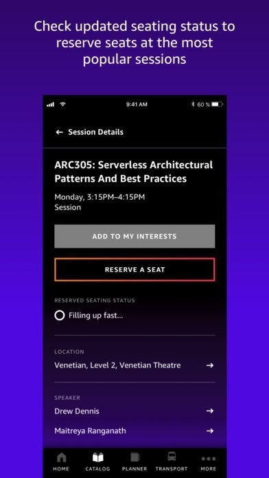 気になるセッションがあれば、お気に入りに登録しておいたり、アプリから直接セッションへの参加予約を申し込むことも可能です。画面右上から予約したセッションを確認することができます。