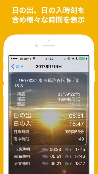 友人とよく日の出の写真を撮りに出かけるので、これで正確な時刻を調べることができてとてもいいです!