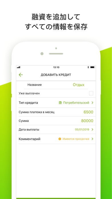 クレジットタイプ(モーゲージ、ミクロ借金)、金額、レート、期間、月賦払い、払込期日