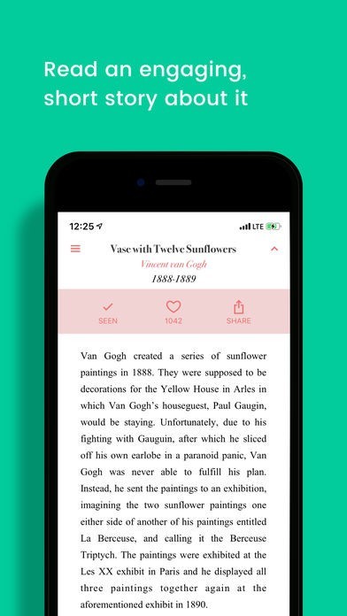 Do you want to know why van Gogh cut off his ear? Or who is the lady on Picasso's portrait? How Jackson Pollock created his paintings? Open DailyArt and find out. According to Time Magazine, VentureBeat and Mashable, DailyArt is a must-have app for all art lovers.