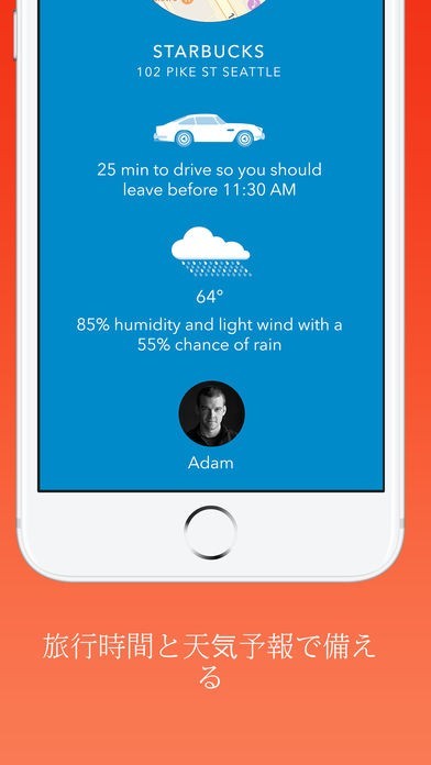 目的地までの移動時間や当日の天気予報を予定と共に一覧で表示することができるので、簡単に予定を管理して当日の準備をすることができます。地図も表示可能になっています。